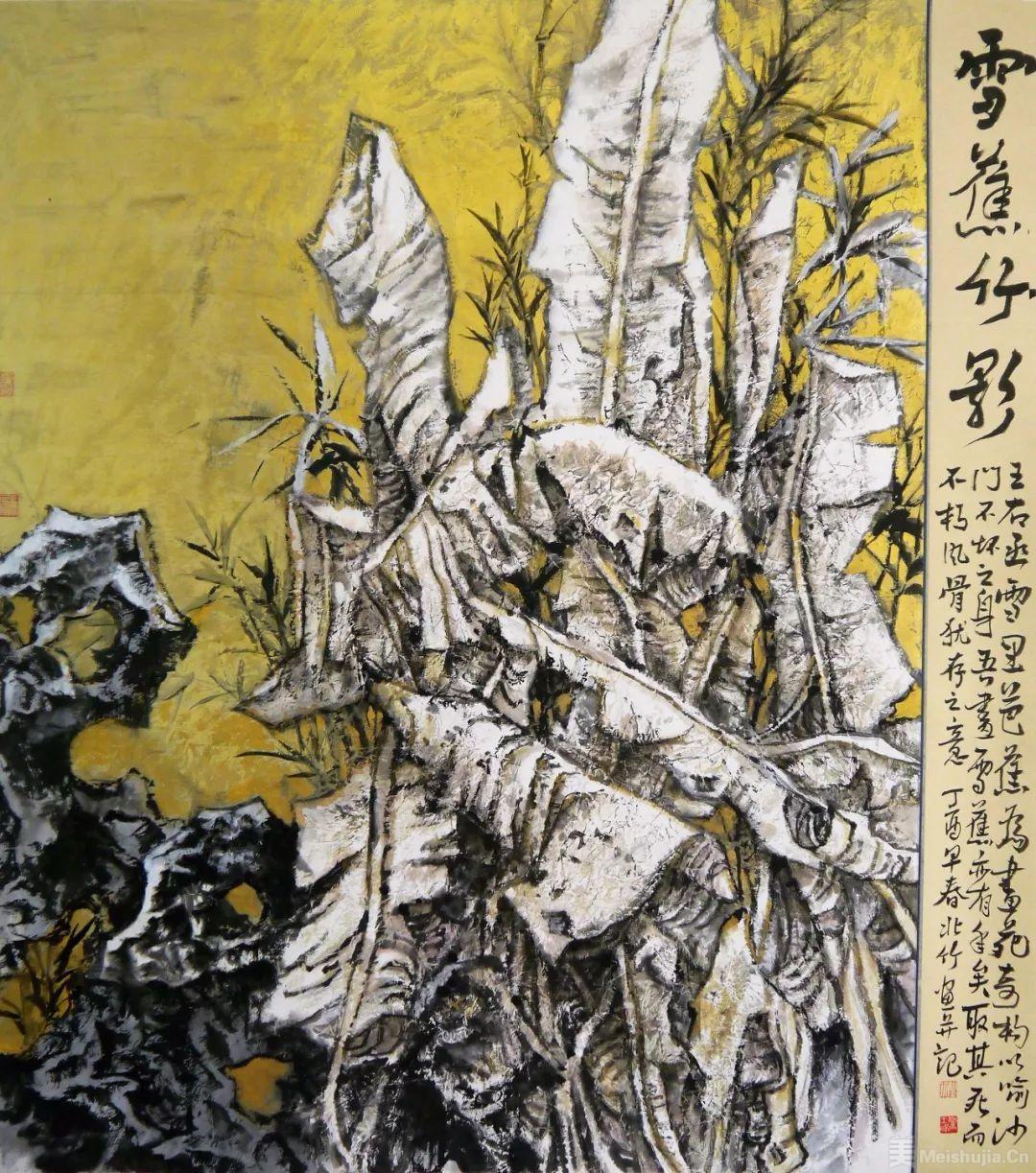 芭蕉情结从十几年前在江城读研时就开始了,学校里一片芭蕉林,长得茂盛,让我这个从江北来的侉子惊叹不已,尤其到了雪天,芭蕉朽而不死,积雪覆身,很是动人,很入画。于是当时画了《春寒料峭》表现雪蕉,画了四条屏《蕉叶翻飞四季诗》来表达对生命轮回的思考,近年又作《雪蕉竹影》系列,在画面的形式语言处理上做了一些探索。一方面想从熟悉的题材积累创作风格,另 一方面也想借助雪蕉营造一个象外之境,一如王维的雪里芭 蕉一直是画苑奇构。