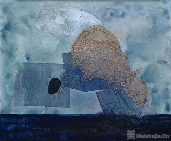 张振江的《山相》看上去也类似这样的抽象山水画。然而,这些山并非都是用笔画出来的,而是用各种手法制作出来的。他把在新疆面对大山作画时,见到的石头子和泥土,他当时穿的衣服以及用的画笔颜料等,都放到了画面之中。这些实物所形成的轮廓和肌理隐喻着山脉的质感和走向。泥土与颜料混合,振江让他们自然龟裂。此外,振江把颜料泼在网子上留下的方格痕迹,这些手法来自他面对那片土地时的感受,材料寄寓着他游走于大山之间的记忆。通过这些与自己身体发生关系的材料和物件,振江把自己印在了“山相”之中。张振江用《山相》命题作画,意思似乎是要表达山的永恒精神,也就是山的法相。金刚经中有“诸相空相“,意思是我们不要被事物的表面现象迷惑,要领悟其真相,即法相。所以,他用非写实的方法去写实山相。