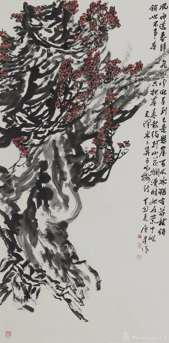 唐建教授寻梅、护梅、画梅、咏梅、师梅的实践,及其团队在梅乡举办“中国梅花精神文化论坛”、艺术展览、义务教学、建立乡村美术图书馆、挖掘红色文化基因、捐资扶贫等一系列文化与社会活动,已将深厚的“红梅精神”熔铸于民族团结与乡村振兴的伟大事业中,赢得了国内外广泛赞誉。经年累月的耕耘,使云南古梅的保护意识深入人心,梅文化的精神内涵得以彰显,极大地促进了当地书画艺术与文旅产业的繁荣发展。云南古梅,正以一种全新的文化姿态,呈现于世界面前。