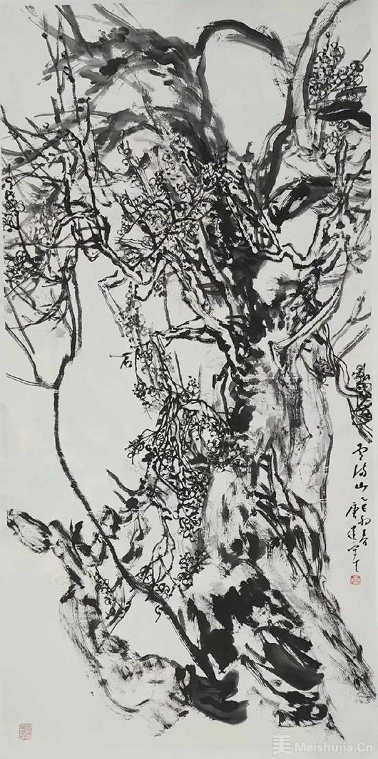 唐建多年在高校及研究机构从事教学和创作工作,于花鸟、山水、人物、书法、篆刻等均有涉猎,在美术史论研究方面也颇有建树。擅长大写意绘画,尤擅画梅。在绘画上遵循宋元以来传统文人画的路径,秉承以德修身、以文养艺的学术理想,追求酣畅淋漓、奔放酒脱、空灵简约、苍劲古拙、质朴情趣的写意精神。他深入生活、扎根生活,以自然为师,以古梅为师,唐建教授历经二十余年的艺术探索,已经形成了古朴典雅的“古梅画风”。传统画梅是一种清、冷、疏的特点,而大自然中的古梅繁盛、古拙、野逸,富有乡土气息。唐教授笔下的古梅不再拘泥于一枝一花、疏影横斜的传统模式,重在通过全景式的构图、枝干的纵横穿插、苍劲浑厚的篆籀笔意,突出古梅的“苍厚”、“繁茂”、“向上”、“高大”,体现老梅的“野气”、“士气”和旺盛的生命力。他的《论画梅》诗:“古法疏疏影横斜,画工孤瘦岂堪夸。吾家狂野任天意,敢教老枝著嫩花。”唐教授笔下的千年古梅是高大挺拔、苍劲繁茂、霸悍雄奇的气象,表现了当下老梅的茁壮与新生。