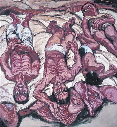 曾:在武汉这样创作时,很多人不明说,但心想这小伙子可能属于半疯状态。我当时非常超前,完全用一种新的表达方式,人们很难理解,会说你画它干嘛呢?这种画面不好看,也没有美感。当时艺术主流是全国美展,作品都是主题性的弘扬,我毫不客气地说那是很虚伪的东西,比方说你住在城里,去农村呆两个星期,回来就画农村一个人放牛什么,它跟你的实质生活完全没关系,是特表面的东西。你每天经历的生活就在身边,应该表现当时内心的生存状态。特表面的东西,只会从特浅层的方式去理解,比如色彩挺漂亮的、构图挺别致的,或者你画的少数民族服装挺新鲜的,没有意思,我作为一个艺术家最反对这样的东西。