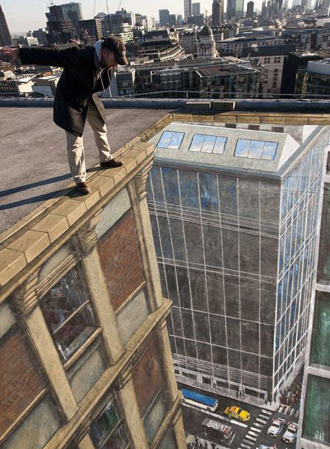 《窗台上的男人》-伦敦艺术家在城市楼顶绘制巨幅3D画