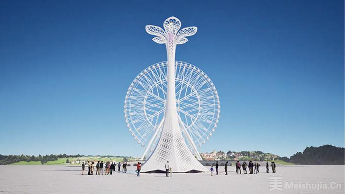塔体的造型着重刻画六瓣雪花与五瓣丁香花的融合。火炬塔上端的丁香花造型巧妙汲取了自然美学的设计理念,呈现丁香花瓣柔美温和的三维自然曲线;下端的“雪花裙摆”则是一场工业美学的艺术呈现;塔体轮廓汲取函数曲线之美,将精密的几何比例与现代工艺相融合,塑造出行云流水般的优雅线条与轮廓。