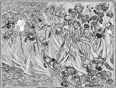 梵高在疗养院的花园里完成了令自己非常满意的作品《鸢尾花》。这幅画通过浓烈的色彩把画面分割成几个区域:大面积蓝紫色鸢尾花占据画面中心,绿色的羽状叶片挺拔着向上生长,一朵孤独的白色鸢尾花在左侧悄然独放,左前方的砖红色土地与背景的万寿菊遥相呼应,整个画面冷暖分明、张力十足。