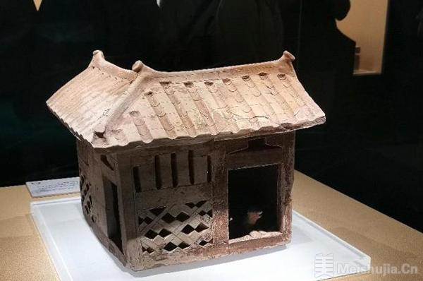 记者从展览中看到,一件由1992年广州市先烈南路大宝岗2号墓出土的曲尺式陶屋,为东汉时期的明器,内有两间房,房后有院落,以低矮女墙为围栏,其四壁有镂空的斜方格和直栏式窗户,并刻划有斗拱、支柱等。正间内塑四俑一犬,侧间的门与后院相通。