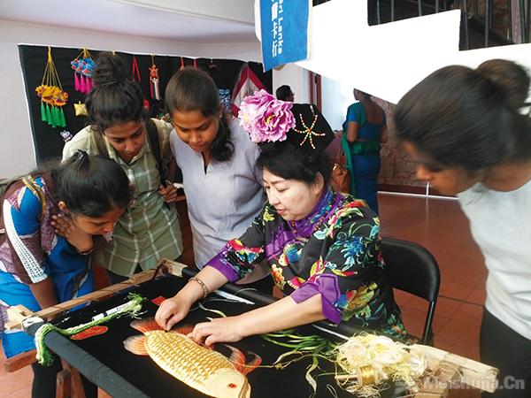 刘雅梅向外国游客展示克东满绣非遗技艺 受访者供图