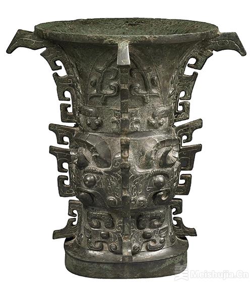 何尊是西周早期盛酒器,通高38.5厘米,重14.6千克。1963年出土于陕西宝鸡贾村镇。何尊造型优美,上圆下方,通体有四道扉棱,上部纹饰以芭蕉叶和蛇纹点缀,腹部和下部分别饰以高浮雕、浅浮雕的兽面纹,纹饰疏密有致,凝重而富有变化。何尊铭文内容为西周历史研究和青铜器断代研究提供了重要的实物资料。其中,何尊铭文中的“宅兹中国”为目前所知“中国”一词最早的文字记载。