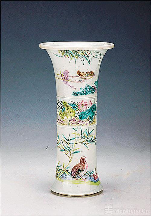 安居乐业图作为器物装饰图案,在清乾隆时期开始出现,嘉庆、道光二朝更为流行。因“鹤”与“安”、“菊”与“居”、“落叶”与“乐业”谐音,由这几种纹饰组成的图案,寓意安居乐业。清代德化窑安居乐业图花觚,现藏于观复博物馆。花觚敞口,细颈,长身,腹部微鼓,平底上加宽圈足,口部和底部都呈喇叭状。与景德镇窑不同,觚内壁施半釉,下部露胎。外部上中下三节,分别以粉彩绘制不同图案。口部绘鸭子戏水,其中一只把头扎入水中,另一只回头观望,河中水草丰盛,岸上草长莺飞,一幅生机盎然的景象,大有“春江水暖鸭先知”的意境。腹部画荷花、荷叶,底部画一只鹌鹑抬头仰望,身后几片竹叶。觚作为中国古代一种用于饮酒的容器,也用作礼器,初现于二里头文化,盛行于商代和西周早期,到西周中期已较为罕见。元、明、清时,仿青铜觚瓷质花瓶较为流行,称为“花觚”。