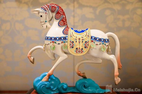 为灵感,融合传统珐琅工艺与现代铜雕技术,造型庄重流畅,珐琅流光溢彩,既显飞天神韵,又寓意青云直上、前程万里。这件作品汇集手工珐琅、金属铸造、花丝烧蓝、宝石镶嵌等多项非遗技艺,展示了中国传统工艺与丝路文明的独特风采。