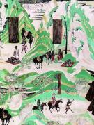 据考,莫高窟四百九十二个存在壁画和塑像的洞窟里,多数都有青绿。在一千多年的营建历程中,每一个朝代的洞窟也大都有青绿,尤以唐代最盛。著名的254窟(北魏)《萨埵太子本生图》和257窟(北魏)《九色鹿王本生图》,山峦、树林、流水、建筑及人物飘带,都是美丽的青绿色彩;217窟(盛唐)《佛顶尊胜陀罗尼经变图》,则是典型的李思训式青绿山水;172窟和45窟(盛唐)《观无量寿经变图》中的反弹琵琶,在绝美的动态间,用青绿色彩画出飘逸的舞带,使整个画面有了华彩炫目、飞扬灵动的效果。众多洞窟里动态优美、形象生动的飞天,其流畅飘逸的彩带和图案,也大都以青绿描绘。《五台山图》(五代)这幅莫高窟现存最大的壁画,在展现精美建筑的同时,亦用青绿色彩描绘了五台山的山山水水和民间风情。至于众多洞窟中数不清的千佛图,更是青绿频出。