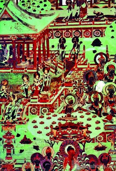 其三,也是更深层次的原因,可能与当时敦煌和莫高窟的生态环境有关。古时敦煌是中国迢遥西部茫茫戈壁上的边关之地。唐代诗人王之涣的名句“春风不度玉门关”,就是对敦煌生态环境的真实写照,而莫高窟又距敦煌五十余里,在方圆四十多平方公里的鸣沙山下,更为苍凉荒芜。从在砾岩上开凿出的洞窟里向外望去,除了沙漠戈壁就是戈壁沙漠。满目枯黄的色彩环境里,人们是多么渴望看到一丝绿意啊。在这大漠戈壁,绿色象征生命,有绿色的地方就有水源,就有植物生长,就可能有人家,也就有了生的希望。
