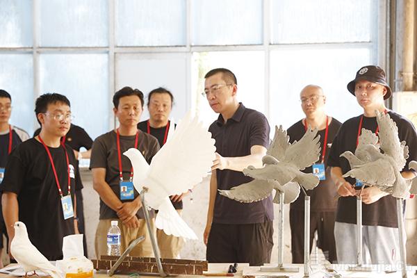 在烽燧形象的上方,还有和平鸽雕塑“展翼飞翔”。14只和平鸽体态优雅平和,体型圆润饱满,飞行姿态各异,颜色如同祥云,与年号台的“曙光红”色彩交相辉映。负责和平鸽雕塑设计和创作的中央美术学院教授卢征远介绍,为完成创作任务,团队做了和平鸽造型艺术化专项研究,通过对经典艺术作品中的鸽子形象和中国传统艺术造型手法进行分析和借鉴,最终选择了以中国本土鸽子“北京白”为原型,采用“高浮雕+圆雕”逐步变化的艺术手法纯手工打造而成。“和平鸽雕塑经历了36道工序,坚持用传统手工的泥塑雕刻方法,凸显其视觉力量。”卢征远介绍说。