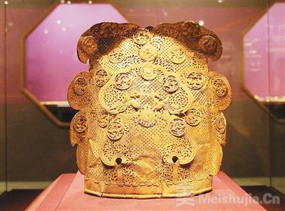 辽代双凤戏珠纹卷云冠由16片形状如云朵的镂空金属片连缀拼合而成,上面还有22枚鎏金圆片,饰有菊花、鹦鹉、雁、飞鸟、太极图案,其纹饰具有典型的中原文化元素。