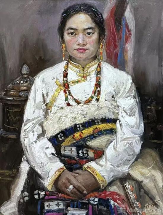 一日天降大雨,无法外出写生,我们便邀请芯草当模特,她欣然应允。旺秀取出她结婚时的盛装——一套绣满藏族特色图案的厚重羊皮藏袍,足有二十多斤重,穿上后连走路都略显艰难。芯草的母亲又拿出诸多珠宝首饰,帮女儿精心装扮。平日里身着汉族便装的芯草,换上藏族盛装后惊艳全场,那美丽大气又略带阳刚的藏族新娘形象,深深震撼了每一位画家。大家兴奋不已,即刻拿起画笔,迅速投入写生状态。
