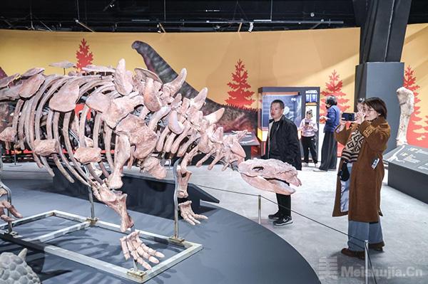 在互动体验方面,展览设计了超10种物理与多媒体互动项目:观众可在“胃石研磨工坊”转动把手,观察胃石如何帮助植食恐龙消化坚硬植物;在“霸王龙咬力大挑战”中模拟霸王龙头部开合,感受其超强咬合力;通过“装甲勇士转转转”为虚拟恐龙匹配防御骨板,了解不同恐龙的生存策略;还能走进“恐龙足迹探秘投影”区域,用脚步触发虚拟恐龙足迹,直观对比不同物种的体型差异。