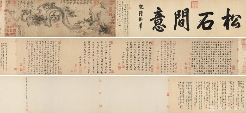 作为北宋文人画的开创者之一,苏轼的画作存世量极为罕见。《偃松图》与《古木怪石图》《潇湘竹石图》等,同为苏东坡精神图像中最具符号性的不朽名作。《偃松图》为纸本手卷,卷后有元末明初大儒张谦、朱惟嘉、郑伯固等题跋,经明代项元汴、李日华李肇亨父子鉴定收藏,入清归康熙辅政大臣索额图长子索芬所有,后进入内府,乾隆时著录于《石渠宝笈》,贮御书房,列为上等,清末始流出宫禁。乾隆皇帝对此图珍爱有加,三次题跋,两度临摹,并命群臣唱和题詠,书于卷后。