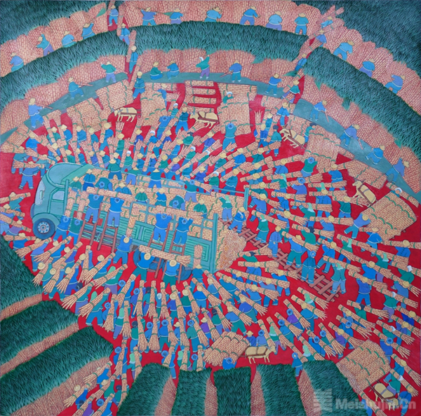 “还有河南省冯国斌、冯宇阁的《鱼肥年丰》、辽宁省薛晓泓的《欢天喜地》等作品则展现了不同地区的年画风格;而在青海、西藏等地,农民画的创作还巧妙借鉴并融入了唐卡艺术的精湛技艺与独特韵味。”吴爽介绍,这一单元的作品,正是这些丰富多彩的民间文化最生动、最直接的图像呈现,它们不仅是农民画家的个体乡愁,更共同拼接成一幅绚烂多彩的中华民俗文化长卷。