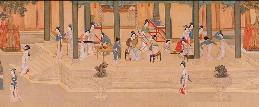画作以春日清晨的汉宫为背景,借亭台轩榭自然划分场景,百余位衣着华丽、姿态各异的人物跃然画上,布局巧妙,色彩艳丽却不失雅致。仇英于卷中精心设置了三处音乐场景,其中最盛大的一处位于房屋前廊,聚焦宫廷乐师们正式演奏前的筹备瞬间。廊下中央两女对坐,一女站立,勾勒出琵琶—阮咸—筝的核心三角布局,成为这幅长卷最大乐舞场面的点睛之笔。