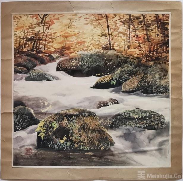 《溪畔秋林》画芯长48.2厘米,宽46.6厘米,钤“冠中写生”朱文印。2024年3月27日,这幅作品在石家庄市博物馆的2024首届河北收藏大展上精彩展出。这幅作品有四大特点。