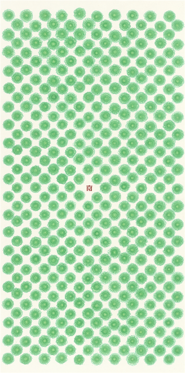 绿色晕点(竖版)/ 设色纸本 / 3D变数 / 69x138cm / 2022