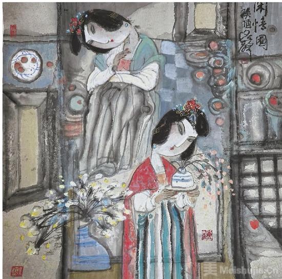 吴声,1943年生于杭州,一级美术师,毕业于中国美术学院。现为中国美术家协会会员、浙江省文史研究馆馆员、杭州画院画师。其作品曾荣获第十三届布尔诺国际绘画设计艺术双年展特别奖,多次获国家级美术奖,多幅佳作被中国美术馆、上海美术馆、浙江美术馆收藏。此次展览聚焦唐仕女题材,以刘禹锡、王维、韦应物等唐代诗人的经典诗句为创作蓝本,笔下丰腴灵动的女性形象,线条融合敦煌壁画的韵律与江南水墨的柔婉,既贴合唐代“以胖为美”的审美风尚,又暗藏鲜明的当代意趣。看似写古之作,却因笔墨节奏、色彩晕染里的现代表达,即便多为早年创作,如今看来依旧耳目一新,其藏于古典形制中的当代创意,更有不落窠臼的艺术巧思。