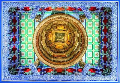 在更细微的层面,藻井还折射出古人对于宇宙的情感。它不是冷峻抽象的几何图式,而是被云龙、莲瓣、海水江崖等纹样填满的“有人情的天空”。盘旋的龙纹,寓意帝王承天受命;舒卷的莲瓣,象征净土与清明;翻涌的水浪,则指向永续不息的生命之流。人们在这样的穹顶之下生活、朝会、祭祀,久而久之,宇宙仿佛成为可以被抬头看见的存在。
