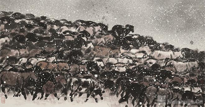 孙志钧以草原题材见长,其作品将深沉的生活体验转化为诗意的视觉语言,为潍坊画坛注入辽阔清新的审美维度;董竟成作为潍坊籍画家,在花鸟创作中融汇恽派没骨传统与书写笔意,构筑出法度与灵性交融的艺术世界;张宜的大写意人物画笔力豪放、气韵奇崛,既承接潍坊历史人物画的精神脉络,亦赋予传统文化形象以当代解读;李东的山水作品意境清远、格调淡雅,遥接宋人寒林意象,传递出静谧深沉的山水情怀。