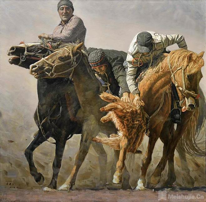 《叼羊》《骟羊》《剪羊毛》《午时》(2021)《金秋》《叼羊之一、之二》(2022)一系列作品是他潜入生活的底层,用具象的语言和坚实的造型隽刻自己对西北民族地区生活美的体悟。《叼羊》系列全画气势激越,令人震颤。这是新疆塔什库尔干塔吉克族的一种传统体育活动,那种凸显男人力量与较量的场景直击房建平的内心。房建平直言安格尔、伦勃朗、塞尚、卢奥等艺术大师均对他产生重要影响。为了强调冲突与运动,画面中尘土飞扬渲染叼羊的争夺异常激烈,人仰马翻的惊险场面让我不禁和鲁本斯的《阿玛戎之战》相关联。画面中的人物的层次绵密,所有的造型服从于旋风升腾的动势。房建平凭借自己娴熟的写实技巧,使线条与色彩取得生动的呼应,每一笔都力求精准的落在物象的结构上,叼羊人群的恣肆似要冲出画面,让猛烈的场面造成一种狂欢的色彩交响。