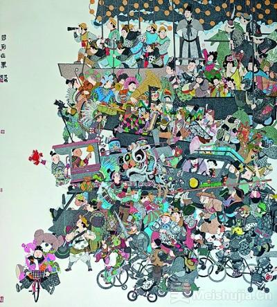 中国艺术家沈鹏的中国画《多彩世界》(图①)以兼工代写的方式,描绘了世界各国人民向着美好生活欢快奔赴的景象。王牧羽、王亮合作的中国画《大江大河》(图②)象征性地描绘出江河图景,同时展现了中华民族从跌宕起伏的历史苦难走向大路坦途的艰辛历程。来自阿尔及利亚的画家拉蕾姆·本菲萨则以丙烯描绘出橄榄叶的繁茂,恰似相交的不同肤色的手,诠释和平共处、共享美好世界的愿景。