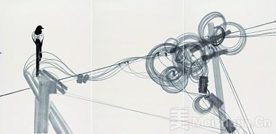 边凯的绢本设色作品《逍遥》以多联画形式对《庄子·逍遥游》进行视觉转译,画面中大量留白供观者补全;波兰艺术家白尾带来的水墨数字长卷以中国传统山水画为基调,暗藏数据层与动态效果,呈现跨越古今的文化表达;来自捷克的伊瑞则以充满温情的笔墨,描绘出日常生活中常见的天线杆与鸟儿(图④)。国际新生代艺术家们在水墨传统感召下所呈现出的千姿百态的探索面貌,尤为亮眼。