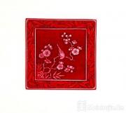 故宫博物院藏明代剔红梅竹寒鹊图方盘,通体髹朱漆,盘心在天锦地上压雕花鸟图案,左下竹石遒劲。婀娜多姿的折枝之上,梅花争奇斗艳,清秀高雅,一只喜鹊引颈逗梅,寓意“喜上眉梢”,呈现出一幅生动的隆冬之景。画面以横线锦文作地表现天空,四边各雕朱漆茶花花叶,间隙中还可以看见黄色的素漆地。