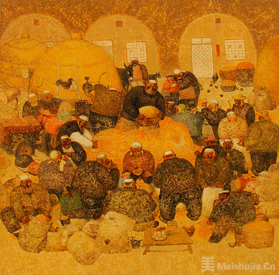 我的根,扎在西海固的黄土里。那里“最不适宜人类生存”,却恰恰孕育了最倔强的生命和最深沉的乡情。我画的从来不是“他者”,而是我的父兄、我的记忆、我血脉里流动的基因。因此,笔下的人物,无论是《丰年图》中挥汗如雨的农人,还是《黄河人家》里温煦的日常,我追求的从不是精致的写真,而是那份从土地深处生长出来的、质朴而坚韧的精神肖像。