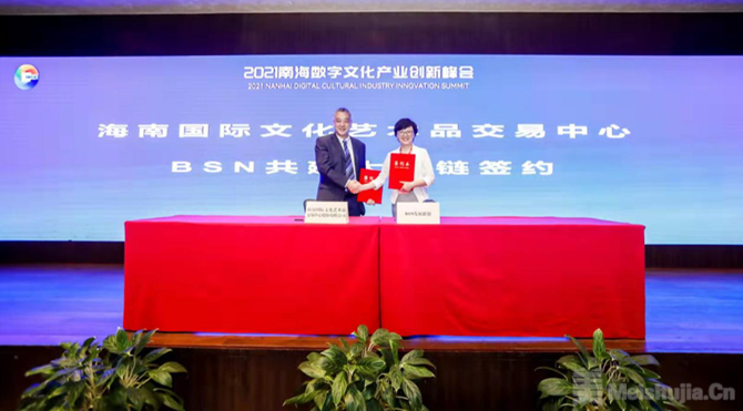 会上举行了一系列签约活动。其中,海南国际文化艺术品交易中心分别与中国BSN联盟、中国品牌网、北京国际设计周有限公司、中国民族文化数字文库、国声智库文化发展中心、北京数智万物科技有限公司、海南科迅众联文化科技有限公司、上海咖菲信息科技有限公司、数字文华(海南)信息科技有限公司、上海边界智能科技有限公司、湖南搜云科技有限公司、湖南搜云科技有限公司等机构签署合作协议,通过利用区块链技术对数字艺术品进行确权保护,共同推进海南国际文化艺术品交易中心文化艺术品交易业态的发展,助推海南数字资产相关业态的先行先试。