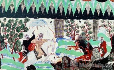 与此同时,树木图像的另一大变化还在于越来越具有层次感,这也是伴随着敦煌壁画中山水的发展而形成的。汉代以来,画师们对山峦的表现往往注重装饰性,连绵起伏的山峦和高低错落的树木仿佛贴在壁面上。魏晋时期画像砖上的场景画以及早期敦煌壁画中的场景画中的物像多平铺而少穿插、遮挡变化,但经过北朝时期的探索,画家们似乎开始有意识地去表现画面中空间的远近关系,他们通过描绘山峦、树木、建筑等物像,表现出一定的层次和纵深。西魏、北周时期,树木图像的类型不断增加,同一种树木图像的形态在绘画中也大大丰富起来,树木的描绘在壁画中越来越有空间感和层次感,这既反映出山水画创作的进步,同时显示了山水画相对独立的发展趋势。