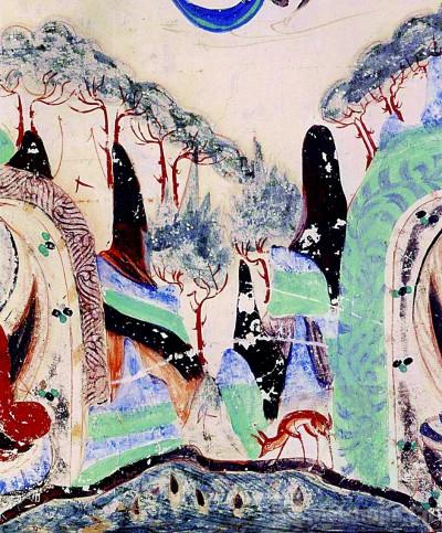 通过进一步对比可以发现,从西魏第285窟开始,敦煌画师们逐渐开始以中原地区绘画及雕刻中的树木图像为粉本和参考,用以再创造敦煌壁画佛教故事中的树木图像背景。山石种类和造型较之以前也更加丰富,明显可以从中找到中国山水画中特有的“勾、点、染、皴、擦”等技法。第285窟壁画中更是出现了类似“荷叶皴”的技法,这都说明了当时的工匠在对山石表现方法进行不断尝试的过程中,受到了中原卷轴山水画的影响。这一时期,敦煌石窟中的山水图像发展成就斐然,山石树木的表现已经从早期的稚拙转向精巧,树木的种类繁多,山石也初现简略的皴法,勾、抹、晕染等画法初现雏形。此时的山水不仅仅起到补白作用,也初步具备了独立的审美价值。