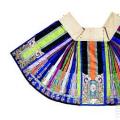 多色缎地绣庭院仕女缀花卉纹月华马面裙 马面裙是中国传统服饰中极具代表性的裙装,其历史悠久,外形独特,工艺精湛,凝结了美用一体、以文载道的人文思想。马面裙的形制定型于明代,由裙腰及两片长方形裙身构成,每片裙身左右两侧各有一个光面,称为“裙门”。穿着时,裙门两两重合,形成里外搭叠的形态。 清代是马面裙发展的繁盛期,裙型有阑干、月华、凤尾、百褶鱼鳞等多种式样,且极重视前后马面部分的装饰。裙身多以刺绣