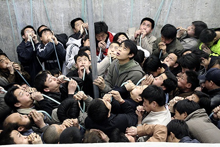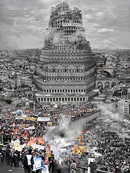 与此同时,在巴比伦塔的巨大阴影之下,一群城市里的农民工们正在试图通过比拼他们的肺活量,把一根垂悬在高高的旗杆上的红旗给吹动起来。他们鼓足了腮帮,对着固定在旗杆尾部的塑料管里吹气,似乎下定了决心要把红旗吹得高高飘扬,猎猎作响,然而违背了客观物理规律的可笑举动只能让他们的唐吉可德式的一切努力显得那么的徒劳和悲壮。