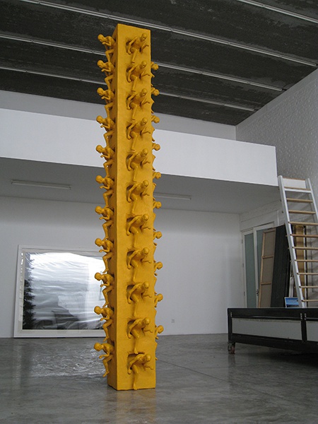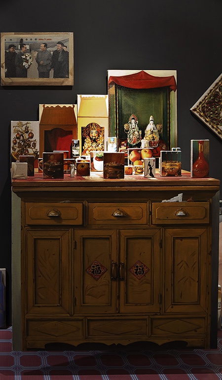 于是一个博尔赫斯式的有着多重交叉路径的空间即将诞生,错乱和多维的时空在这里遭遇与叠加。当一个人在其中漫步时,他会在昏暗的小路上看到萨满教的巫术在巨大空洞的人的脑袋里面种上了稀奇古怪的植物,这些植物犹如大脑的回沟与皱褶,思想就在其中明灭不定;在脑袋的上方是新的创世纪的狂想,无数的3D数码技术创造的人物在光影变幻的天堂和地狱之间沉浮挣扎,那是对米开朗琪罗的西斯廷天顶画的当代敬礼和面向未来的无限暇思。而在人间的地方,一个中国乡村老太太的卧房供桌上,孔夫子,财神爷与观音菩萨这三个儒释道的神仙一起安然享受着民间香火的供奉与膜拜,与他们位置并列的是这个国家的第一代政治领袖的合影。作为这一切的背景的则是一个矗立在路的尽头的巨大的巴比伦塔。它高耸入云,由从网上收集起来的中国和亚洲各大都市的无数的建筑工地和摩天巨楼的影像堆砌而成。巴比伦塔的神话是在告诫人类妄图取代上帝的野心,而亚洲各国对于现代性这一最大的意识形态神话的狂热追求体现在了对于表现经济成功和奇迹的最直接有效的标志和符号:摩天高楼的无限渴求和喜爱上。这些摩天高楼就是现代的巴比伦塔,它们主宰了亚洲城市的天空,像一根根硕大的阳具,刺向雾霾笼罩的天空。