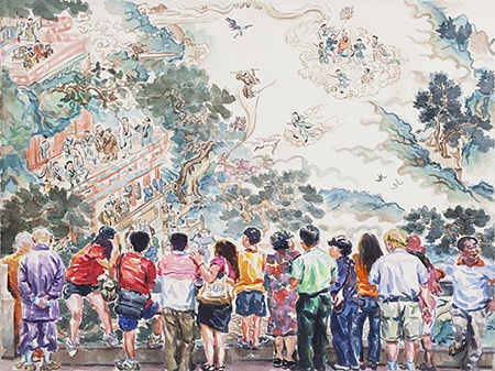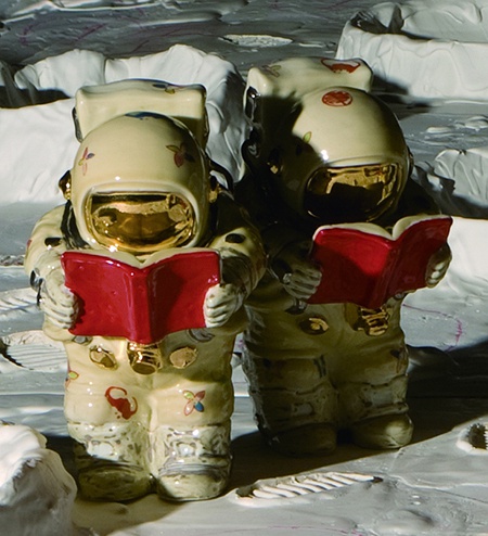 而广场的东边却是另一番景象,一个街心公园里聚满了各种游客,都在朝着公园里的小山上凝望。中国人的神话传说里的各路神仙们此刻都在山上翩翩起舞,飞天与钟馗在热闹地吹啦弹唱,好像是某一个乡村的草台歌舞班在城里卖艺演出,琵琶和二胡的乐声穿透了寂寞的广场。而透过蜻蜓人在空中的瞭望,一场战争的游戏在地平线上将要开场。人类是如此地热爱这种游戏,达摩克力斯之剑悬挂在看不见硝烟的战场之上。但这好像又真的只是一场儿童的游戏,堆满食物包装盒的小小塑料餐桌就是坦克和士兵列队对峙的战场。在离游戏战场不远的空地上,三四个宇航员们站在玻璃钢制作的灰白色的高台之上。高台模仿了月球的地形地貌,似乎是在拍摄宇航员登月的历史性的景象。宇航员们手捧着小小的红宝书,象征着民族的复兴与希望。只是不知这是商业炒作的一场表演,还是对阿波罗登月计划的赞扬?