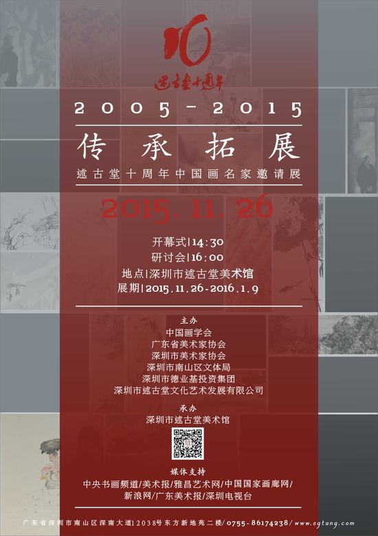 由中国画学会、广东省美术家协会、深圳市美术家协会、深圳市南山区文体局、深圳市德业基投资集团、深圳市述古堂文化艺术发展有限公司联合主办的《传承拓展·述古堂十周年中国画名家邀请展》将于2015年11月26日下午2:30在深圳市述古堂美术馆隆重开幕,此次展览为述古堂十周年之庆典。展览邀请来自全国各地近百位书画艺术名家莅临述古堂,展示诸家佳构,名家聚集,精品荟萃,蔚为大观。届时,“民营美术馆可持续性发展”研讨会于26日下午16:00在述古堂举行。此次研讨会邀请深圳及周边各民营美术馆负责人围绕主题进行讨论民营美术馆的生存之道。