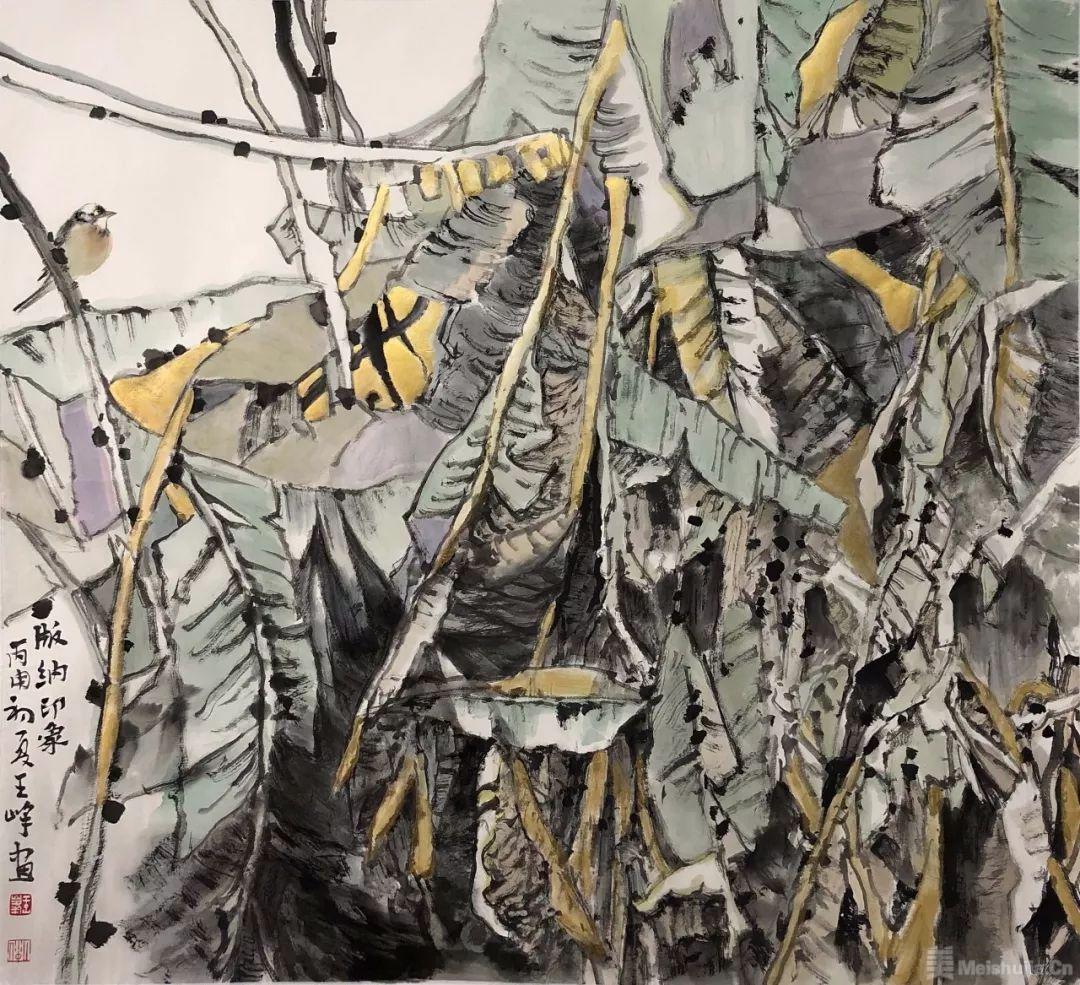 芭蕉情结从十几年前在江城读研时就开始了,学校里一片芭蕉林,长得茂盛,让我这个从江北来的侉子惊叹不已,尤其到了雪天,芭蕉朽而不死,积雪覆身,很是动人,很入画。于是当时画了《春寒料峭》表现雪蕉,画了四条屏《蕉叶翻飞四季诗》来表达对生命轮回的思考,近年又作《雪蕉竹影》系列,在画面的形式语言处理上做了一些探索。一方面想从熟悉的题材积累创作风格,另 一方面也想借助雪蕉营造一个象外之境,一如王维的雪里芭 蕉一直是画苑奇构。