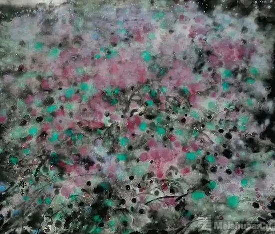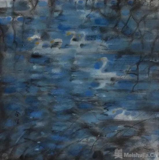 本次展览共展出34幅作品,展览以艺术家周南平的个体经验为基点,将从视觉上分三个板块,由近景、中景到远景,逐步呈现艺术家对日常生活的追忆和絮语。在这些作品中,周南平为充分营造出深邃的氛围,使用了满幅的构图,没有传统水墨画的留白,在混乱中寻找秩序,如《蓝湖》《莲塘》《三月》等作品繁而不乱,灵动自然。技法上,他选取灵动自由的点笔造型,尽可能摆脱线条对形体边缘的束缚,并辅以晕染和大笔擦涂,笔墨缝隙间,斑驳的点好似闪烁的微光。《冬溪》《小河》《岸柳》系列作品便是如此,意境悠远并充分调动观者思绪。