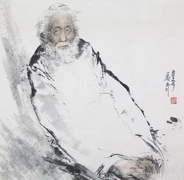 乔玉川是中国画全才、通才,不仅人物、山水、花鸟三科兼擅,而且三科融会贯通,无论人物、山水、花鸟表现的都是人的精神、自然的生命、画家的人格,这在当代中国画名家中也比较罕见。三科会贯通的关键在于写意笔墨。他早年在西安美院中国画系学习,精通工笔,还学过油画,非常悉素描写实造型,经过几十年的修养和历练,他的写意笔墨日臻纯熟,表现力强,变化微妙,酣畅淋漓。他今年创作的古代和现代人物作品,已不是纯写实的造型,而是表现性的意象,几乎完全是以写意笔墨来塑造。他的人物形体吸收了山石的皴法,也采用了山石的结构,人物的面部或以线条勾勒,或以墨骨晕染。不仅如石刻玉雕,兼有山的阳刚气势和水的阴柔韵味。他的写意笔墨干湿浓淡的虚实处理也体现了阴柔相济、阴阳调和的道家美学。