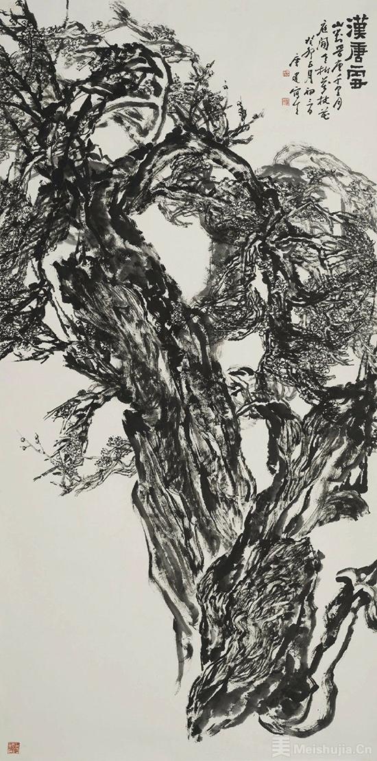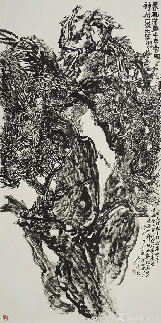 唐建多年在高校及研究机构从事教学和创作工作,于花鸟、山水、人物、书法、篆刻等均有涉猎,在美术史论研究方面也颇有建树。擅长大写意绘画,尤擅画梅。在绘画上遵循宋元以来传统文人画的路径,秉承以德修身、以文养艺的学术理想,追求酣畅淋漓、奔放酒脱、空灵简约、苍劲古拙、质朴情趣的写意精神。他深入生活、扎根生活,以自然为师,以古梅为师,唐建教授历经二十余年的艺术探索,已经形成了古朴典雅的“古梅画风”。传统画梅是一种清、冷、疏的特点,而大自然中的古梅繁盛、古拙、野逸,富有乡土气息。唐教授笔下的古梅不再拘泥于一枝一花、疏影横斜的传统模式,重在通过全景式的构图、枝干的纵横穿插、苍劲浑厚的篆籀笔意,突出古梅的“苍厚”、“繁茂”、“向上”、“高大”,体现老梅的“野气”、“士气”和旺盛的生命力。他的《论画梅》诗:“古法疏疏影横斜,画工孤瘦岂堪夸。吾家狂野任天意,敢教老枝著嫩花。”唐教授笔下的千年古梅是高大挺拔、苍劲繁茂、霸悍雄奇的气象,表现了当下老梅的茁壮与新生。