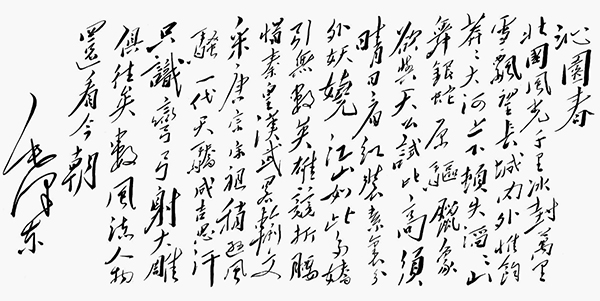 《沁园春·雪》:北国风光,千里冰封,万里雪飘。望长城内外,惟余莽莽;大河上下,顿失滔滔。山舞银蛇,原驰蜡象,欲与天公试比高。须晴日,看红装素裹,分外妖娆。江山如此多娇,引无数英雄竞折腰。惜秦皇汉武,略输文采;唐宗宋祖,稍逊风骚。一代天骄,成吉思汗,只识弯弓射大雕。俱往矣,数风流人物,还看今朝。该词上片描写北国壮丽的雪景,展示了大气磅礴、旷达豪迈的意境,抒发了词人对祖国壮丽河山的热爱。下片议论抒情,评论历史人物,歌颂当代英雄,抒发无产阶级的豪情壮志。全词意境壮美,气势恢宏,感情奔放,胸襟豪迈。