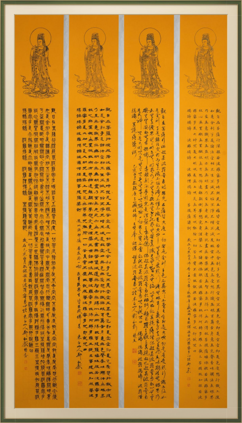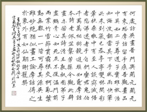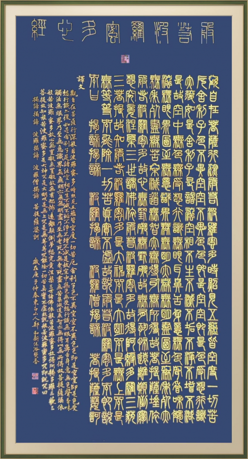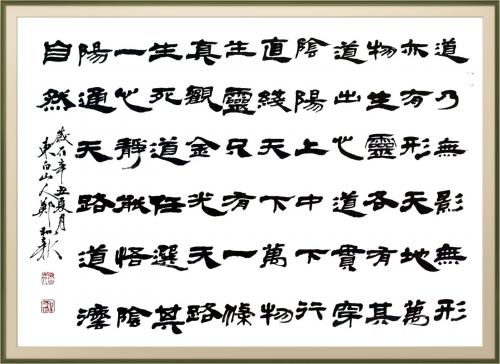 郑公五体皆精,楷书为最。魏晋隋唐无所不临,心之所想,手之所追,皆有所得。精密严谨,纤细之中见力度。字形精工,体势紧凑,平正有度,险绝于微毫。笔走间不激不厉,心手相应,静中显动,简净之笔,清雅自见。尝译诸典籍为华章,以楷书传之,诸如《颜氏家训》《无量寿经》《道德经》卷帙浩繁,皆出其手。其篆书,沉稳中藏古意,劲健中含流动。取法秦汉,结体开阔,如山川之势,静若磐石,动若风行。笔触沉实,筋骨内敛,方圆之度皆在腕下游走,俯仰之间,神气自生。字形若金石刻痕,刚柔相济,隐见锋芒,古意浑然不露痕迹。远观如岳峙,近赏如松柏交映,气象恢弘,动静相融,雄浑处自有奇姿。然其隶书之法,承自汉碑,韵致舒展,取《石门》遗风。字势磅礴,笔画从容,蚕头之妙,燕尾之神,字字透气,含而不露,蕴而不发。再观其行草,法度森严,而笔势纵横,恣意挥洒中自见规矩。字里行间,龙蛇竞走,气象万千,起伏跌宕间,笔势内敛又不失纵情。观者心生叹服,余韵绕梁,久久不绝。