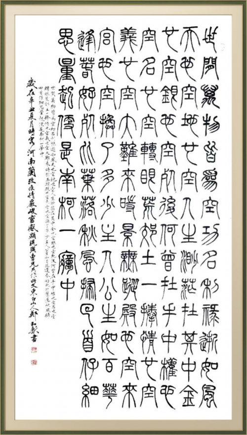 其书法艺术,五体兼善,各臻其妙。楷书如谦谦君子,在精密严谨中彰显端庄大气;篆书似远古回响,雄浑古朴间流淌着岁月沧桑;隶书若清风拂柳,舒展韵致里蕴含着自然之美;行草像江河奔涌,纵横恣肆中尽显豪情壮志。每一幅作品,都是他艺术灵魂的具象化呈现,既传承着中华书法的正统血脉,又烙印着鲜明的个人风格。