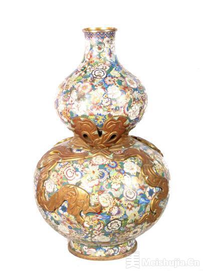 “清掐丝珐琅百花葫芦瓶”瓶体近一米,瓶身呈葫芦状,口部、底足均鎏金,各錾刻一圈回纹。除口沿下部外,葫芦瓶通体满饰百花纹,束腰处为蝴蝶结形绶带,表面施以鎏金,饰暗红色细碎云纹。葫芦瓶采用掐丝珐琅工艺制作而成,在铜胎上勾勒线条,用很细的铜扁丝掐制成相应图案焊于器物表面,以随类附彩的方法将珐琅釉料填进丝间,经焙烧、打磨、镀金而成,展现了乾隆时期掐丝珐琅工艺的高度成熟。