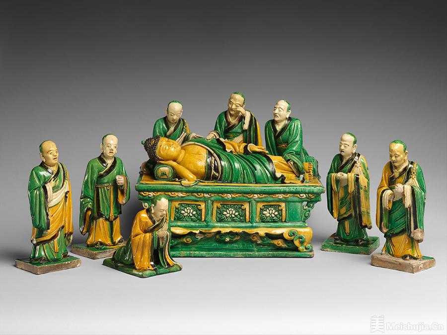 明清时期,景德镇窑制瓷技艺精湛,釉色、彩绘丰富,陶瓷雕塑呈现出若干特点:作品釉彩装饰鲜艳华丽,使人感到重釉彩而轻雕塑;独立的雕塑少,“附丽”的饰器多,比如各种兽形钮、耳、柄、足和象形器;人物雕塑以佛教、道教题材为多,比如佛、菩萨、罗汉造像,三清、八仙、福禄寿星、财神造像;置地大作少,案几摆件和清玩小件多,比如各式文房器具、禽兽瓜瓠等。美国大都会艺术博物馆收藏的明弘治素三彩佛陀涅槃及弟子群雕像,就是明代景德镇窑瓷塑的杰作。明清德化窑白瓷雕塑工艺精湛,驰名中外;瓷塑艺术大师何朝宗,塑像深富神韵,将白瓷雕塑艺术推向高峰。此外,宜兴窑富有文人气息,石湾窑富有民间气息,各具特色、各有擅胜。明清时期还盛行建筑琉璃雕塑和砖雕装饰,留下了一些重要的古建遗存,比如明代大同九龙壁、清代紫禁城宁寿宫九龙照壁等。