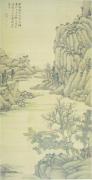 沈周以虚实相映的笔墨设色,将近石、远山、丛树、人物与舟楫巧妙安排,画面开阔而层次分明。山石皴法以短披麻皴与牛毛皴为主,密而不乱。远山淡墨晕染,意境空灵。至于人物、舟船等景致,皆以高古游丝描细细勾勒,笔法精妙,处处可见画家功力。